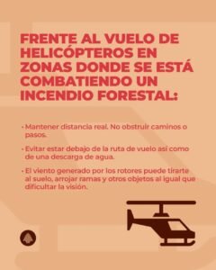 Ante el intenso movimiento de helicópteros en las zonas donde se combate el incendio forestal, las autoridades recuerdan una serie de medidas clave para evitar accidentes. Se solicita mantener distancia, no obstruir caminos ni accesos, y evitar ubicarse debajo de las rutas de vuelo o de las zonas de descarga de agua.