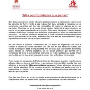 En un comunicado difundido este viernes, los Salesianos advirtieron que el debate no puede reducirse a una respuesta rápida con tinte punitivo y recordaron el documento “Más oportunidades que penas”, donde se plantea que sin educación, acompañamiento y políticas preventivas, el problema se repite.