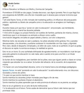 En un extenso mensaje publicado en redes sociales, la docente y militante educativa Analía Santos expresó su indignación ante el bono educativo anunciado por el Gobierno del Chubut, que finalmente resultó de $28.800, lejos de los $150.000 prometidos.