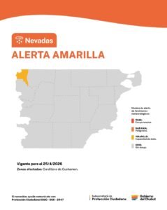 Desde el organismo indicaron que en las zonas más bajas las precipitaciones podrían presentarse en forma de lluvia o aguanieve, por lo que recomiendan circular con precaución y mantenerse atentos a la evolución del pronóstico.