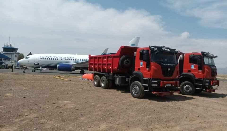 En el marco del combate contra los incendios forestales en la Comarca Andina, este jueves 8 de enero de 2026 continúan las tareas logísticas en el aeropuerto de Esquel, donde camiones cisterna de Vialidad Nacional abastecen las reservas de agua utilizadas por el Boeing 737 Fireliner.