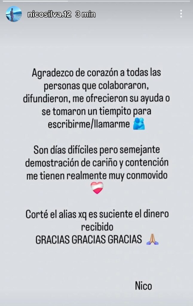 También aclaró que cortó el alias de la colecta tras recibir el dinero suficiente para afrontar la emergencia, y remarcó: “Gracias, gracias, gracias”.