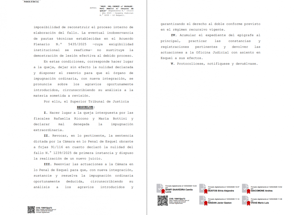 Con esta decisión, el tribunal dispuso que las actuaciones sean reenviadas a la Cámara Penal de Esquel, que deberá intervenir nuevamente con una integración distinta de jueces para resolver los planteos de fondo de la defensa que habían quedado pendientes.