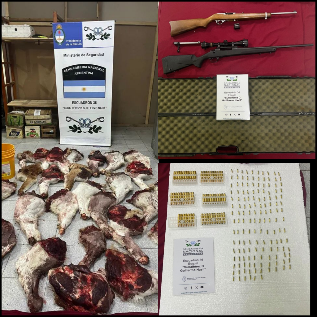 Un operativo de control preventivo realizado por personal del Escuadrón 36 Esquel de Gendarmería Nacional terminó con el secuestro de seis guanacos faenados, dos fusiles y municiones, en un procedimiento llevado a cabo en la provincia de Chubut. El hecho ocurrió el 19 de abril de 2026, en la intersección de la Ruta Nacional 40 y la Ruta Provincial 62, en el acceso a la zona de Arroyo Pescado.