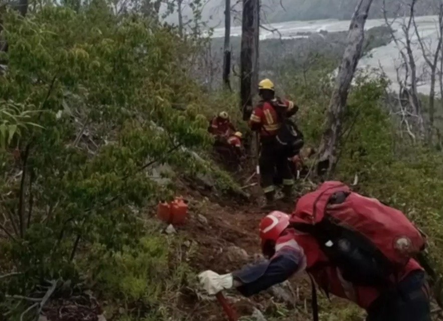 La extinción del foco se ve gravemente obstaculizada por el combustible vegetal pesado que arde persistentemente en el lugar. A esto se suma la topografía accidentada y las difíciles condiciones del terreno, que no solo entorpecen el desplazamiento del personal de línea, sino que también representan un riesgo significativo para su seguridad, con la presencia de material rodante.