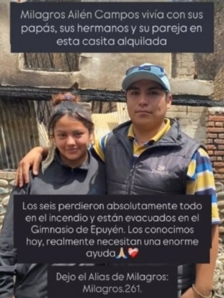 Los incendios forestales que afectan a la Comarca Andina siguen dejando historias de profundo dolor. Una de ellas es la de Milagros Ailén Campos, quien vivía junto a sus padres, sus hermanos y su pareja en una casa alquilada en Epuyén que fue completamente destruida por el fuego.