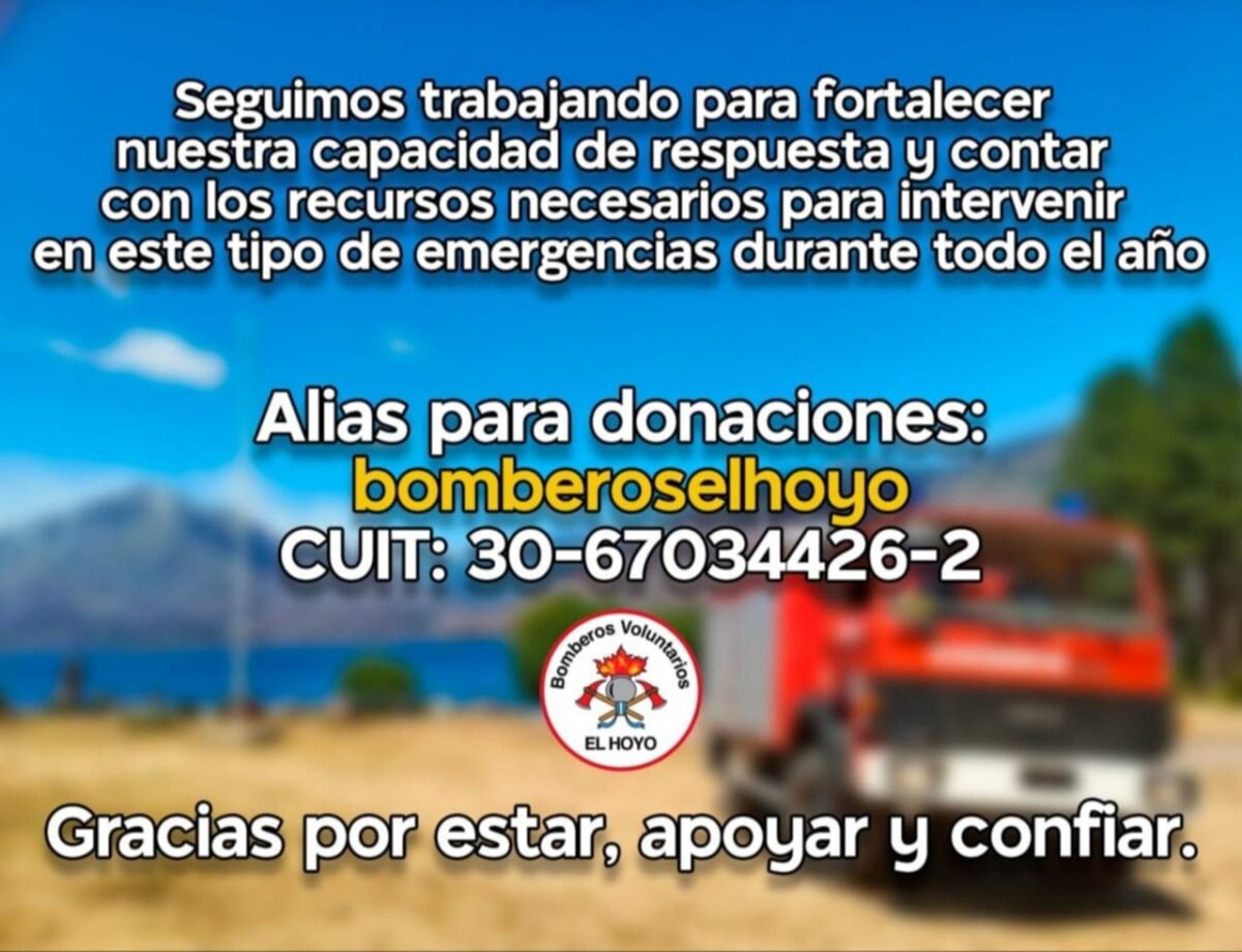 Los Bomberos Voluntarios de El Hoyo reafirmaron su compromiso con la comunidad, asegurando que seguirán trabajando coordinados y atentos mientras la emergencia lo requiera. Además, informaron que quienes deseen colaborar económicamente con la institución pueden hacerlo mediante el alias oficial bomberoselhoyo (CUIT: 30-67034426-2), contribuyendo a fortalecer la capacidad de respuesta y garantizar los medios necesarios para intervenir en este tipo de siniestros durante todo el año.