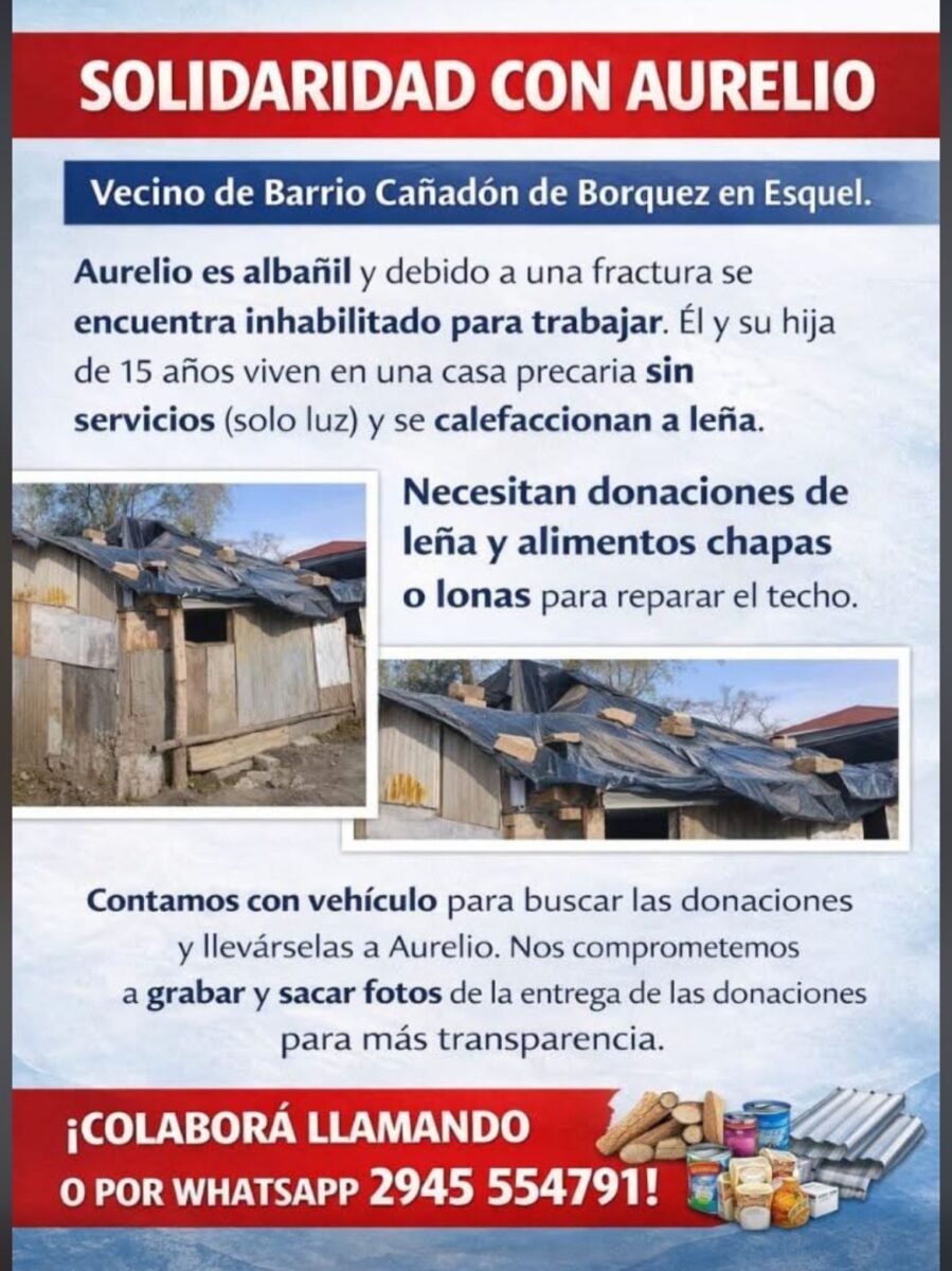 Se trata de Aurelio, albañil que actualmente no puede trabajar debido a una fractura, lo que limita sus ingresos y su capacidad para sostener el hogar. Según se informó, vive con su hija de 15 años en una vivienda precaria que no cuenta con servicios básicos, a excepción de la electricidad, y se calefacciona a leña.