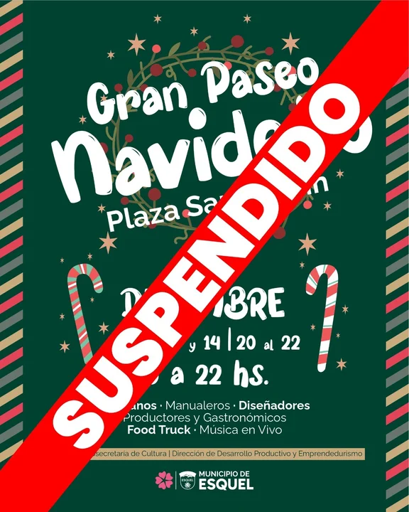 El Gran Paseo Navideño de Esquel, que estaba previsto para este 13 y 14 de diciembre en Plaza San Martín, quedó suspendido por la alerta amarilla por vientos y probabilidad de lluvias emitida por el Servicio Meteorológico Nacional.