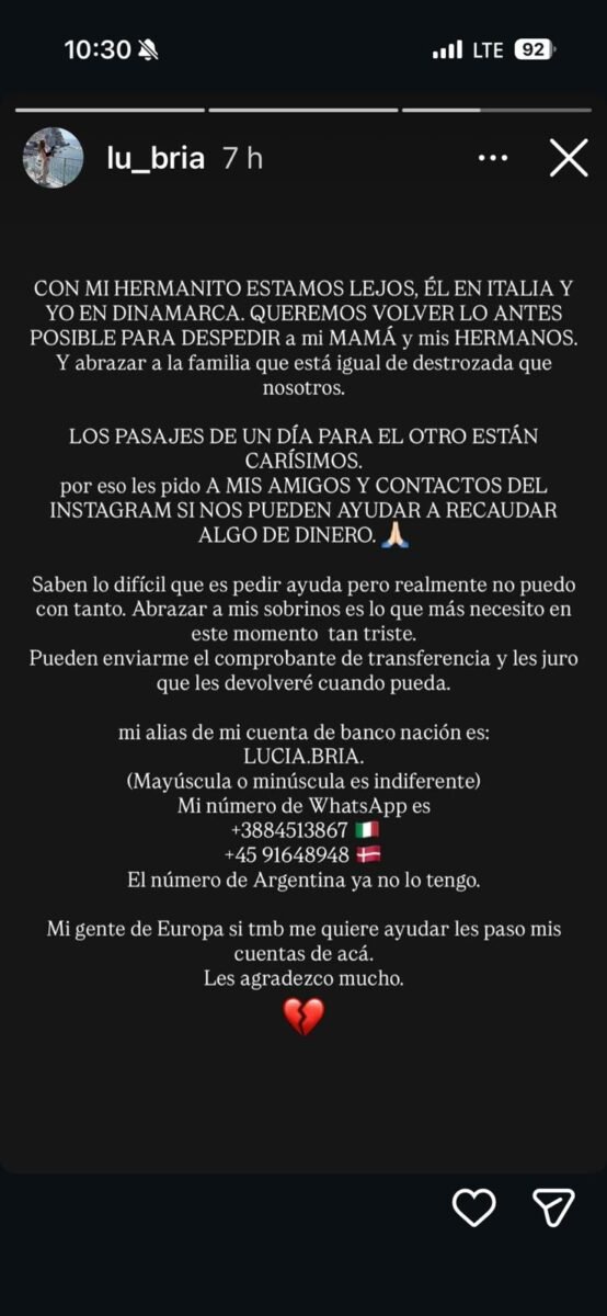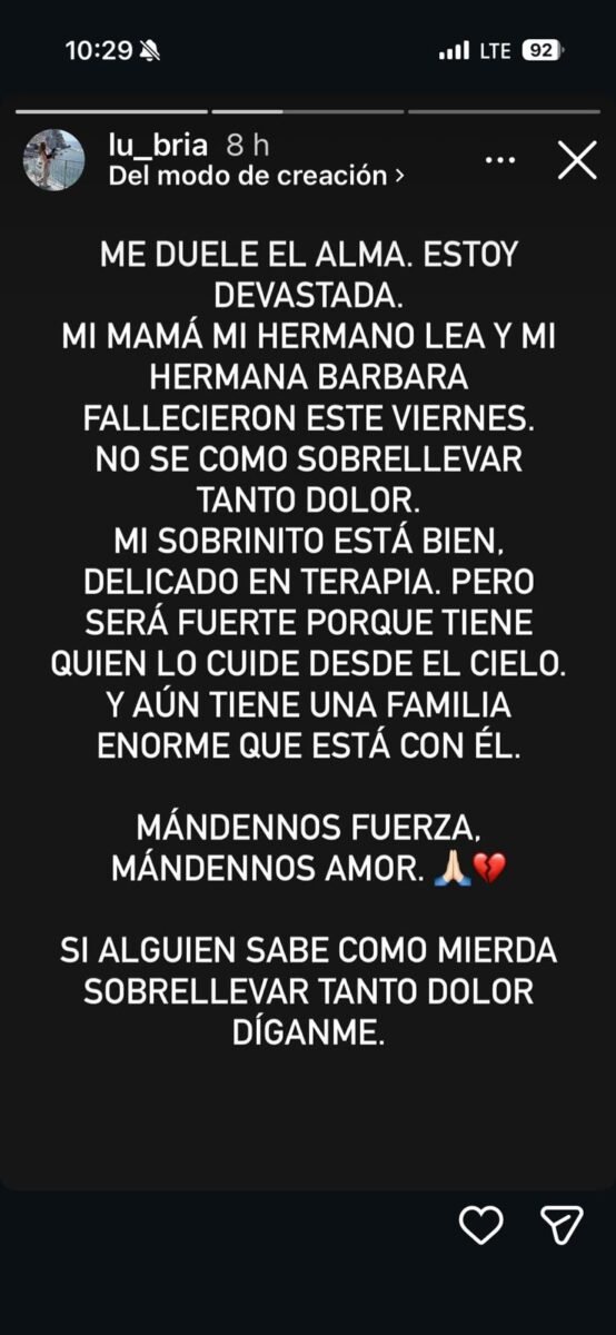 La tragedia golpeó por partida doble a los hermanos que se encuentran viviendo en el exterior. Lucía, desde Dinamarca, y su hermano menor, desde Italia, recibieron la noticia a miles de kilómetros de distancia. A través de sus redes sociales, Lucía compartió el calvario que atraviesan: «Estoy devastada. No sé cómo sobrellevar tanto dolor. Abrazar a mis sobrinos es lo que más necesito en este momento».